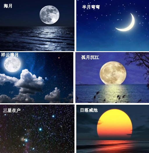 注释:形如海月的地形,穴位在海月的中间;半月弯弯的地形,穴位半月的两个角上;祥云捧月的地形,穴位在乳窝处;孤月沉江的地形,穴位在月角;三星在户的地形,穴位在中间的那颗星上;日落咸池的地形,穴位在咸池的涟漪处。