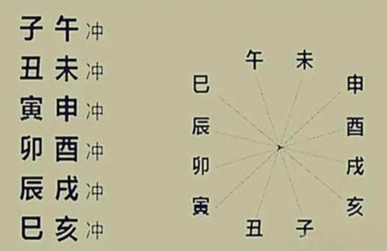 十二地支中有六对地支互相冲,分别是子午相冲,丑未相冲,寅申相冲,卯酉相冲,辰戌相冲,巳亥相冲。