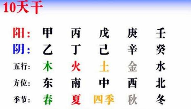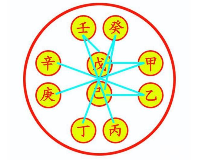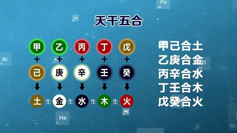 4.天干相合:甲己合土,乙庚合金,丙辛合水,丁壬合木,戊癸合火。