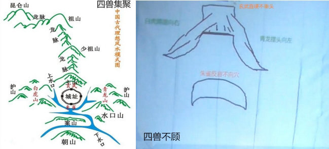 在“四兽聚集”的这种地方建穴就能使我们升官发财,人丁兴旺。在四兽聚集的地方就是龙穴的位置。如果四兽不顾穴位,这种情况就不好。就是玄武拒尸,青龙白虎远离穴场,“朱雀反背”也叫“朱雀腾去”,在这个位置做穴位,就不能人丁兴旺,升官发财,还会倒大霉。