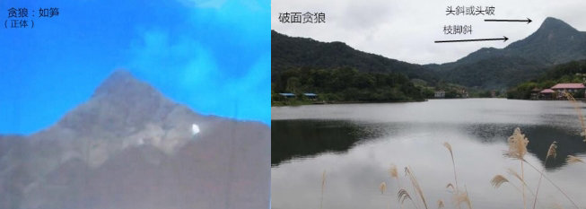 “若是斜枝便不同,斜枝侧顶为破面,尖而有脚号乘龙”如果山峰虽然像笋一样顿起,但是它的脚却是斜的,那它就不是贪狼的正体;实际是贪狼的变体。如果顿起的贪狼它的支脚和顶部都是斜的或破的,这种就叫“破面贪狼”。就像猪有家猪有野猪,这种“破面贪狼”是以凶来论。