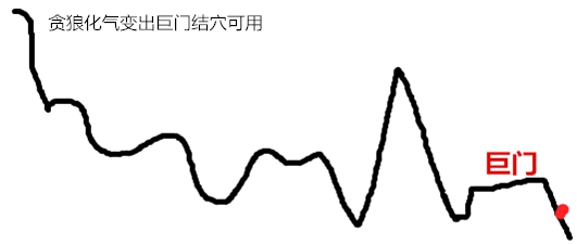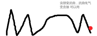 例如上图红色的“出阵贪狼”在特殊情况下,有的时候玄武也会垂头,垂头下来就会结穴,贪狼从高变到低,到最下面变成武曲山峰化气,化气之后就会结穴,不化气就不会结穴。