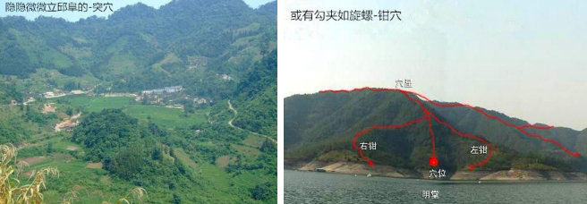 “或有勾夹如旋螺”,有的时候落入山下的山龙会左右起类似“钩子或夹子一样的地貌”,这种地貌我们称之为“钳穴”。